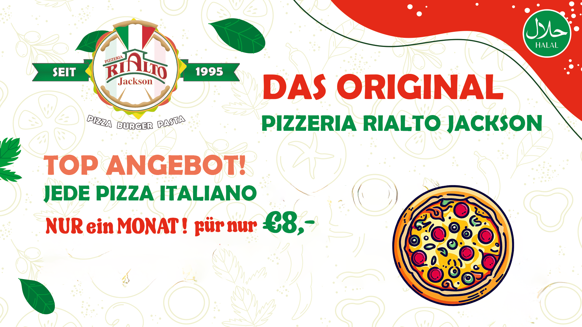 Bei Zustellung ganztägig, ab 3 Speisen:jede Pizza außer mit * gekennzeichnete, sowie kein Auflagentausch möglich