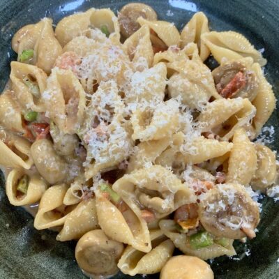 rosa Sauce, Schinken, Salami, Speck, Champignon